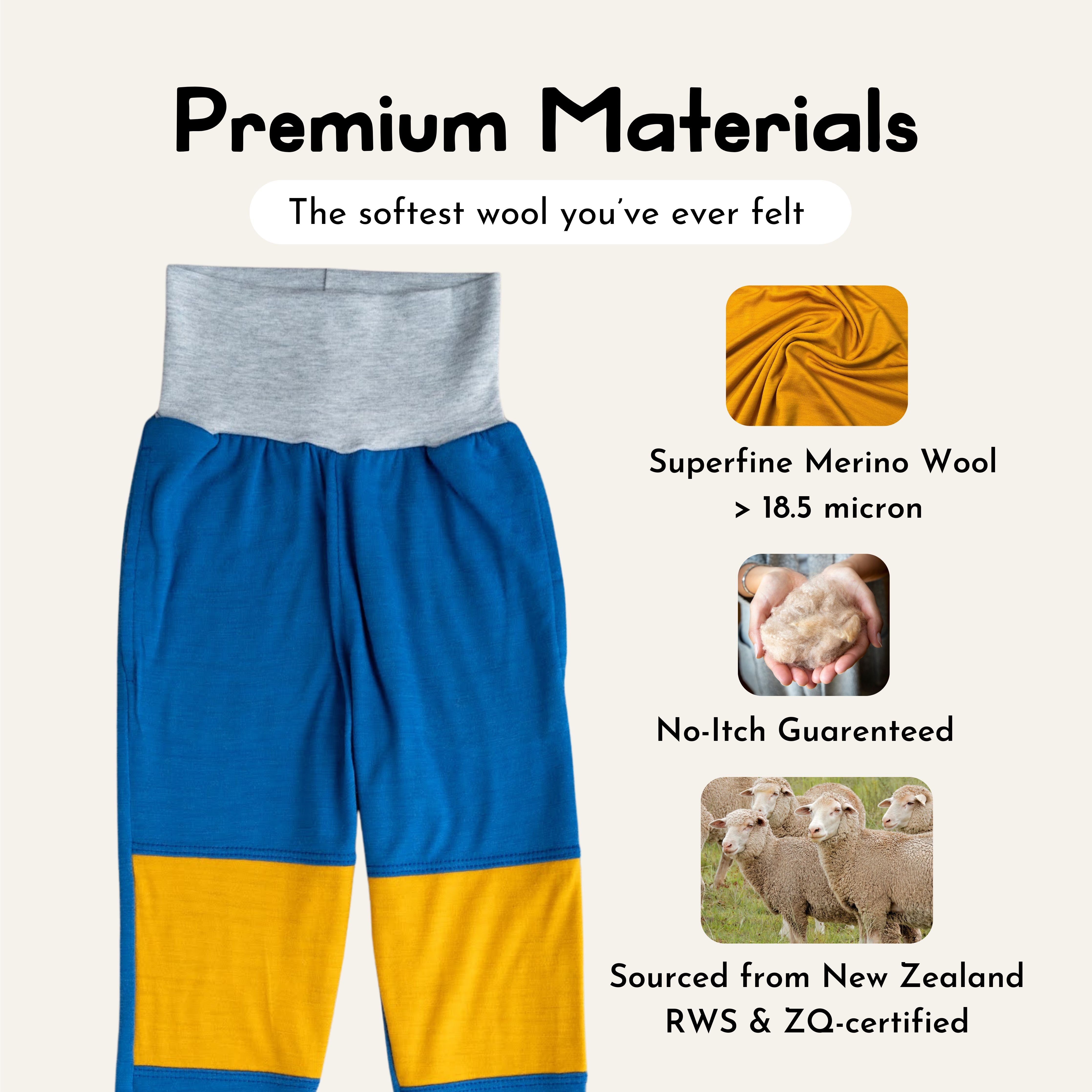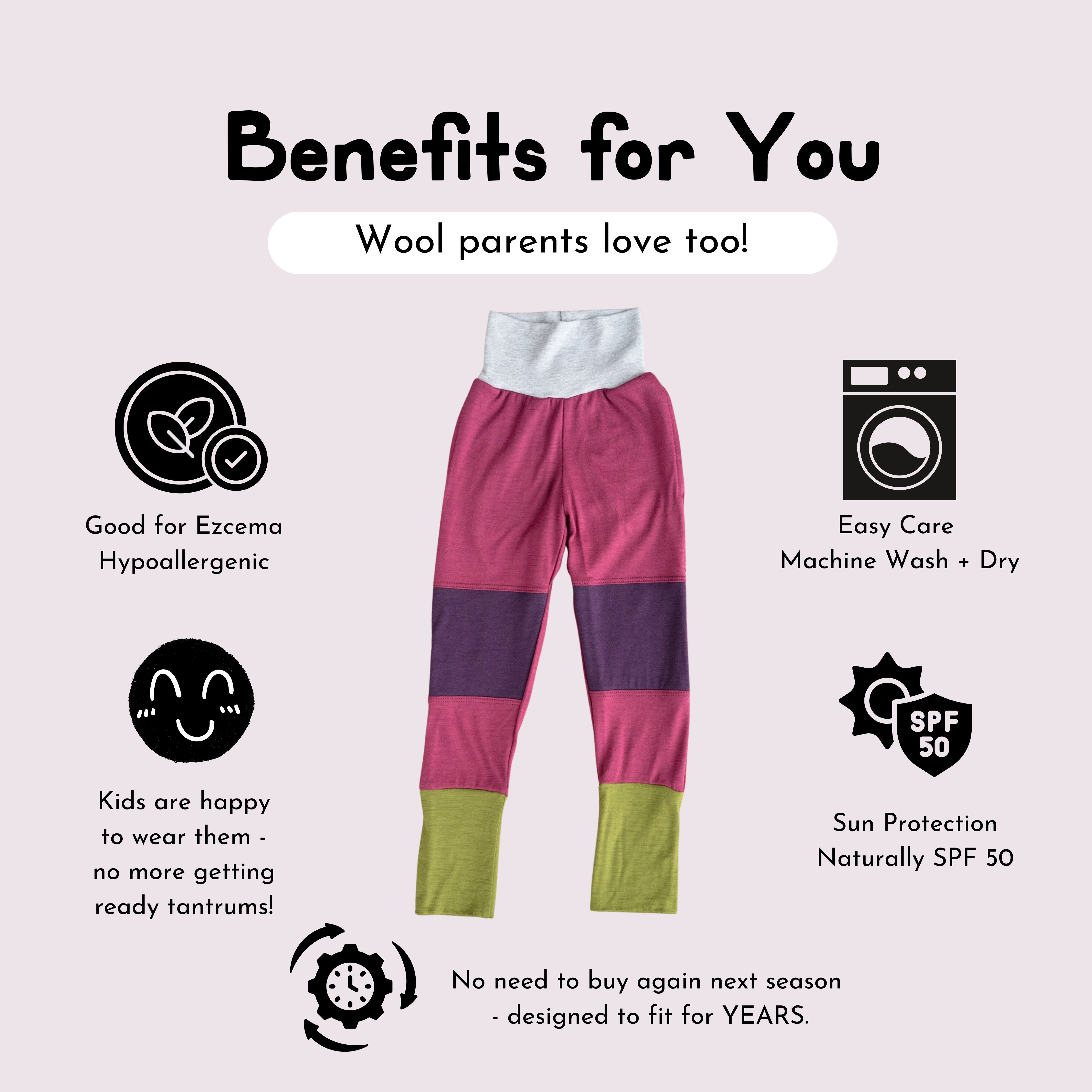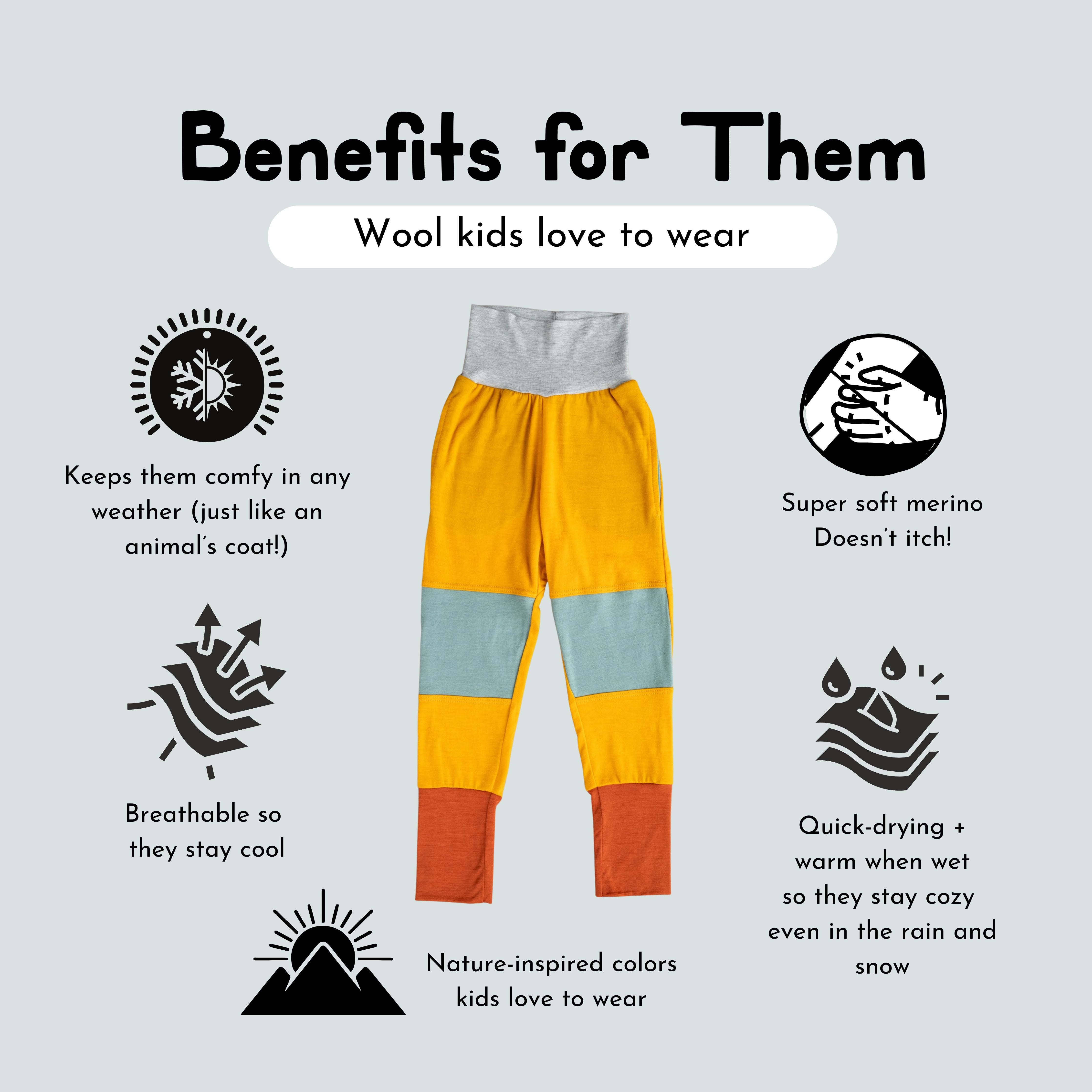 Meet the Pocket Rocks Merino Joggers - the most versatile pant they own. These pants have a looser fit through the hips and upper leg with a gusset for maximum mobility. They also feature reinforced knees, a grow-with-me design, and our super soft 100% merino wool fabric. Plus, drumroll... POCKETS! Perfect as layers, but also great on their own around the house. These pants will be their new favorite.