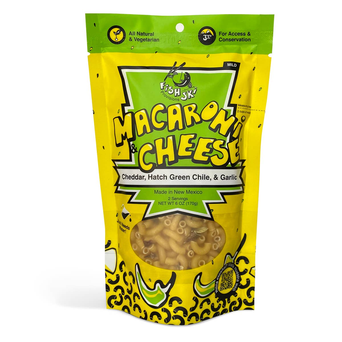 Hatch green chile mac and cheese: FishSki's OG flavor and fan favorite! Macaroni and cheese with cheddar, hatch green chile, and garlic. A medium spicy delight, full of southwestern flavor. Taste the incredible subtle sweet, smoky, crisp taste of green chile from new Mexico's hatch valley. To make our mac and cheese all you need to do is boil 2 cups of water with the pasta and peppers. When all the water is absorbed, add the cheese and spice mix and stir vigorously. Packed in recyclable, portable and pack able, weather resistant bags. As always 3% of every sale is donated to local conservation or access efforts that improve fishing and/or skiing. 6 oz, 2 servings per bag.